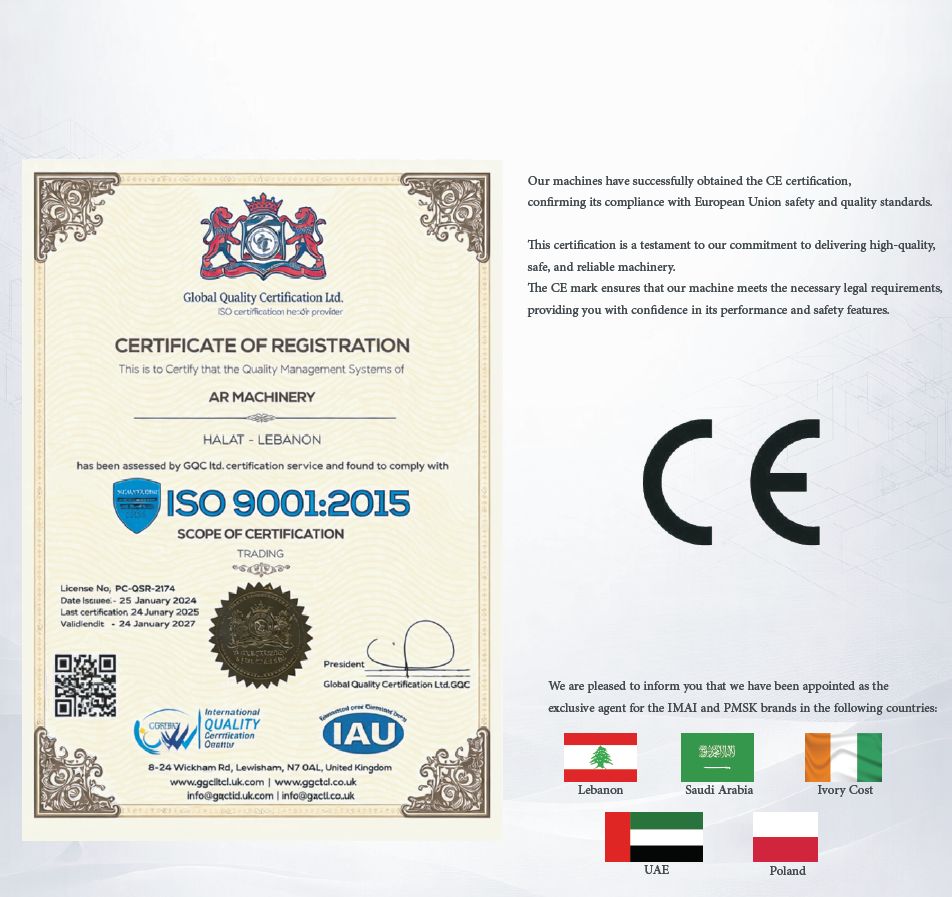 We are pleased to inform you that we have been appointed as the exclusive agent for the IMAI and PMSK brands in the following countries: Lebanon, United Arab Emirates (UAE), Saudi Arabia (KSA), Ivory Coast, and Poland.